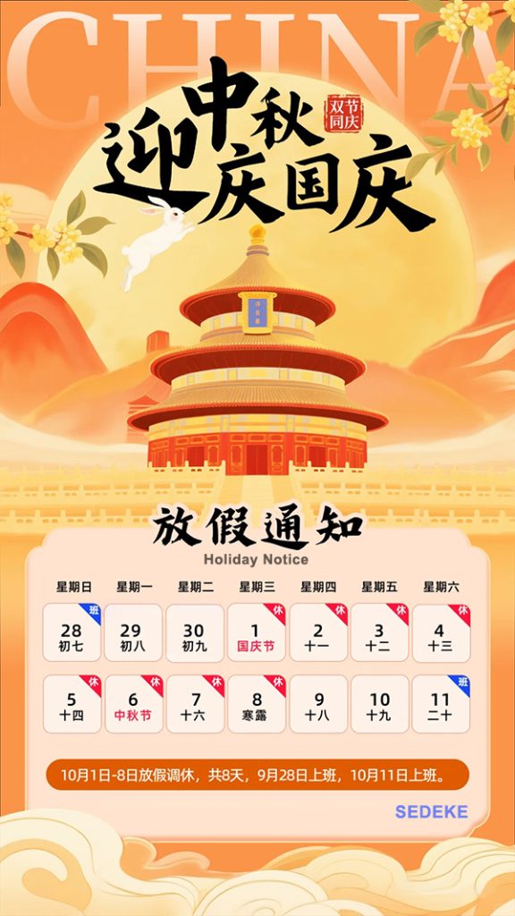 Please note that due to the National Day and Mid Autumn Festival holidays, our office will be closed from October 1st to October 8th.